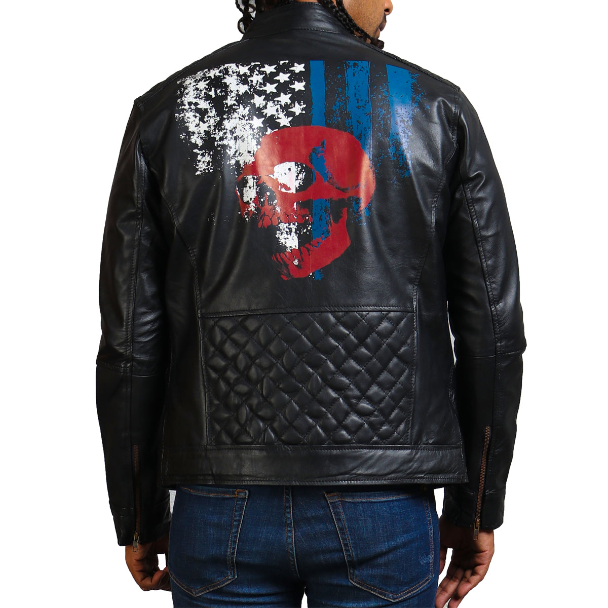 Men's biker skull leather jacket for men in genuine leather. This black leather biker jacket features skull with American flag print on its back