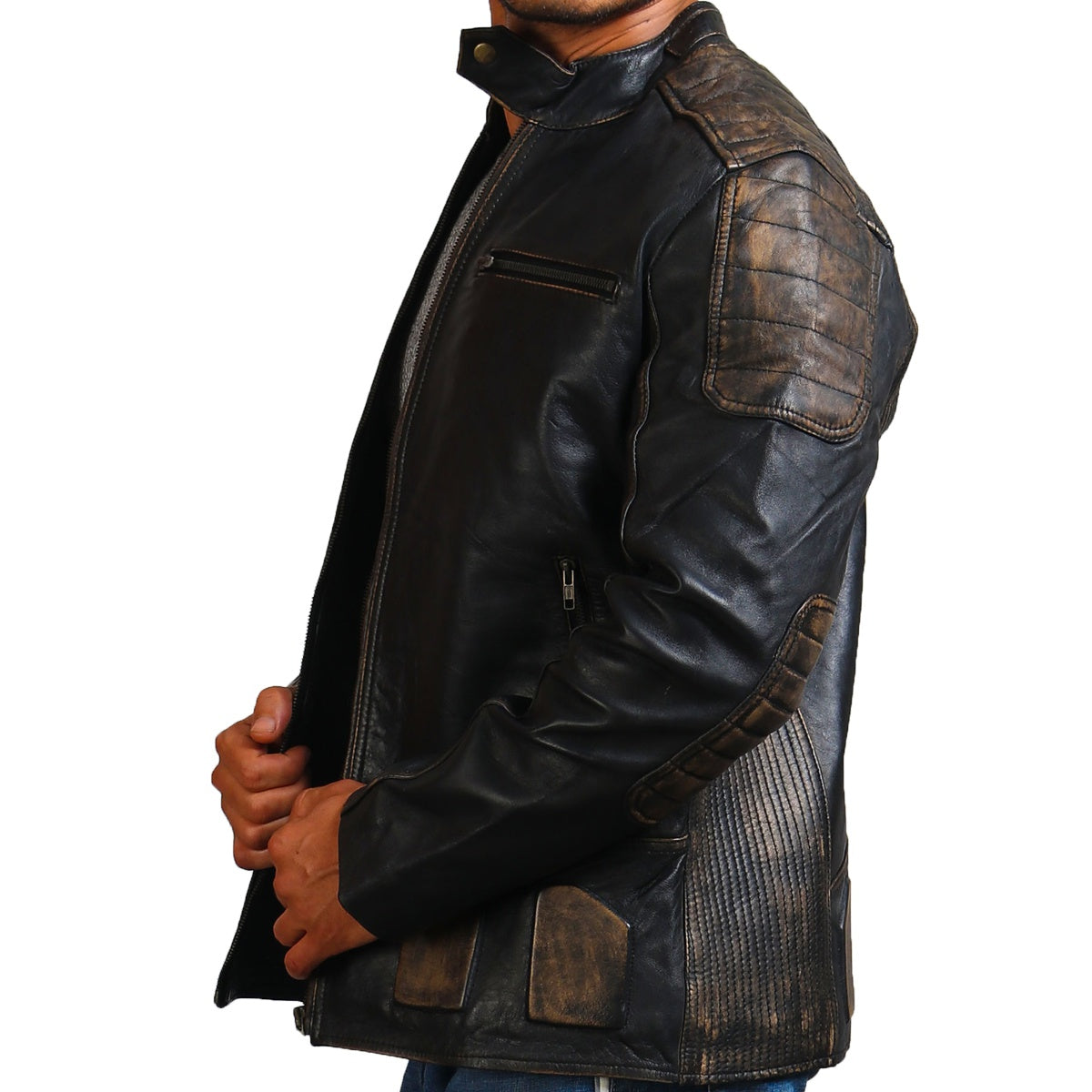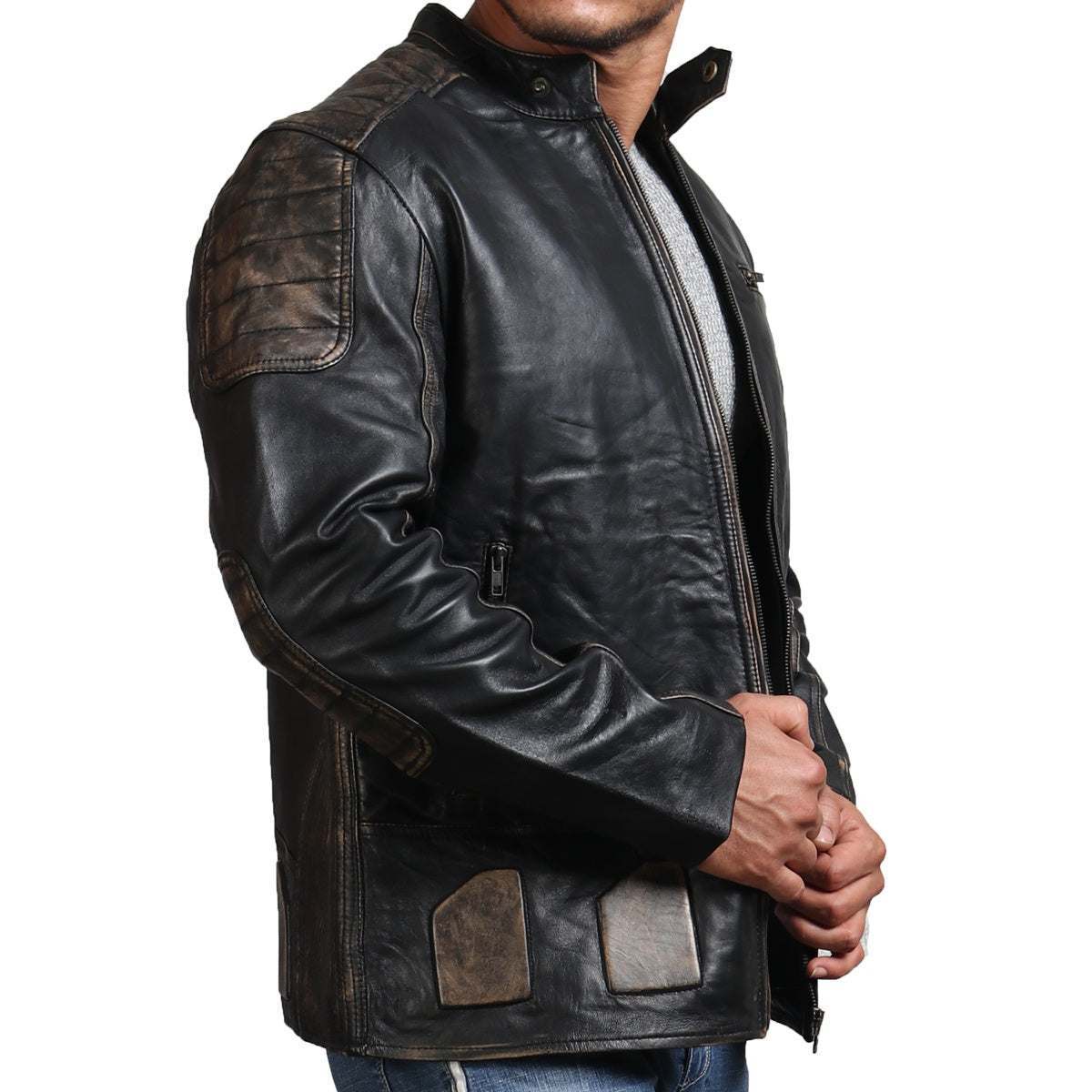 Distressed black biker leather jacket crafted by our skilled employees is made using 100% genuine leather. Men's motorcycle jacket in the color black is the perfect addition to your biker jacket collection.
