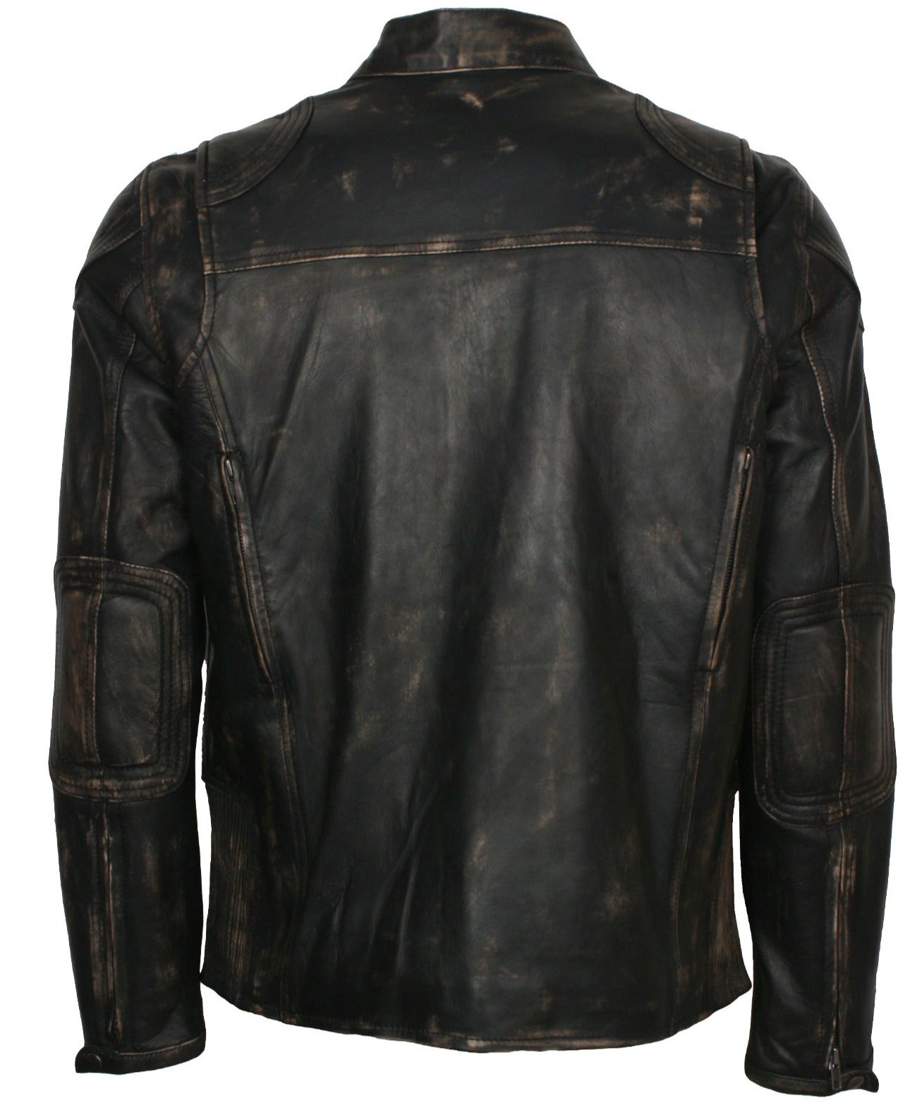 Distressed black leather jacket is manufactured with 100% high quality genuine leather. This zipper leather jacket features a front zipped YKK closure, 6 zipped pockets on its front and 2 zipped pockets on its back.
