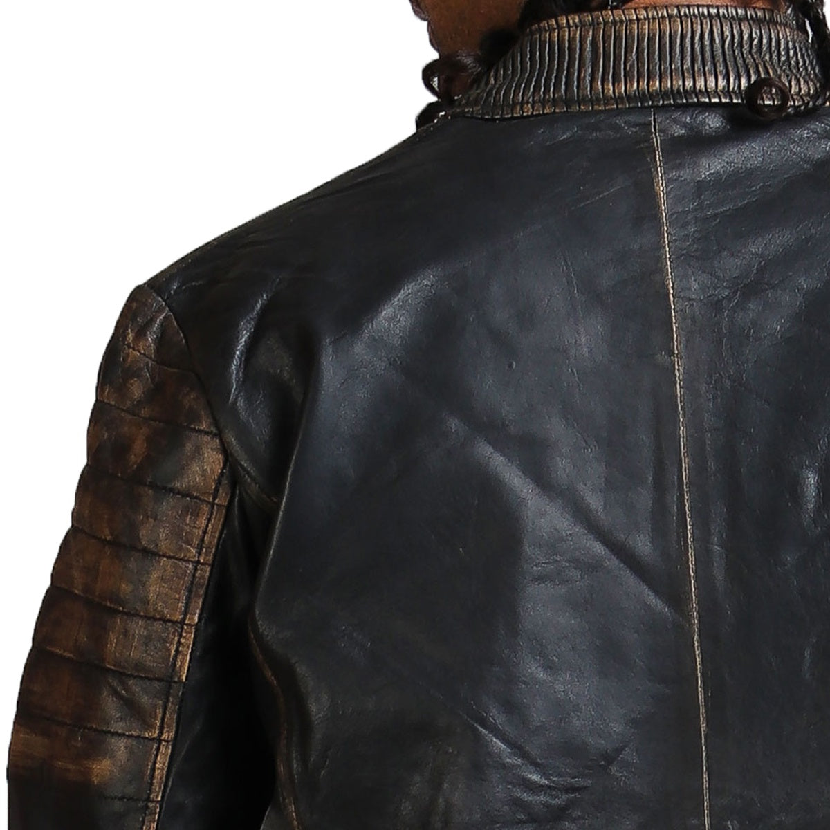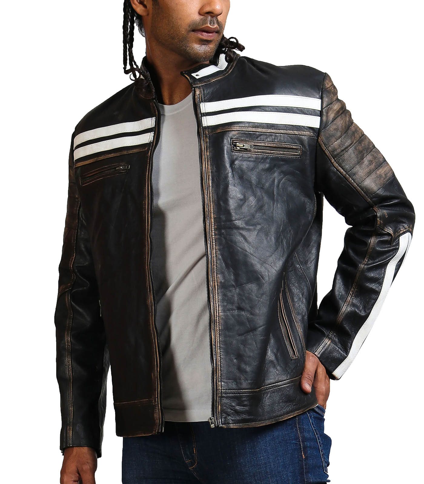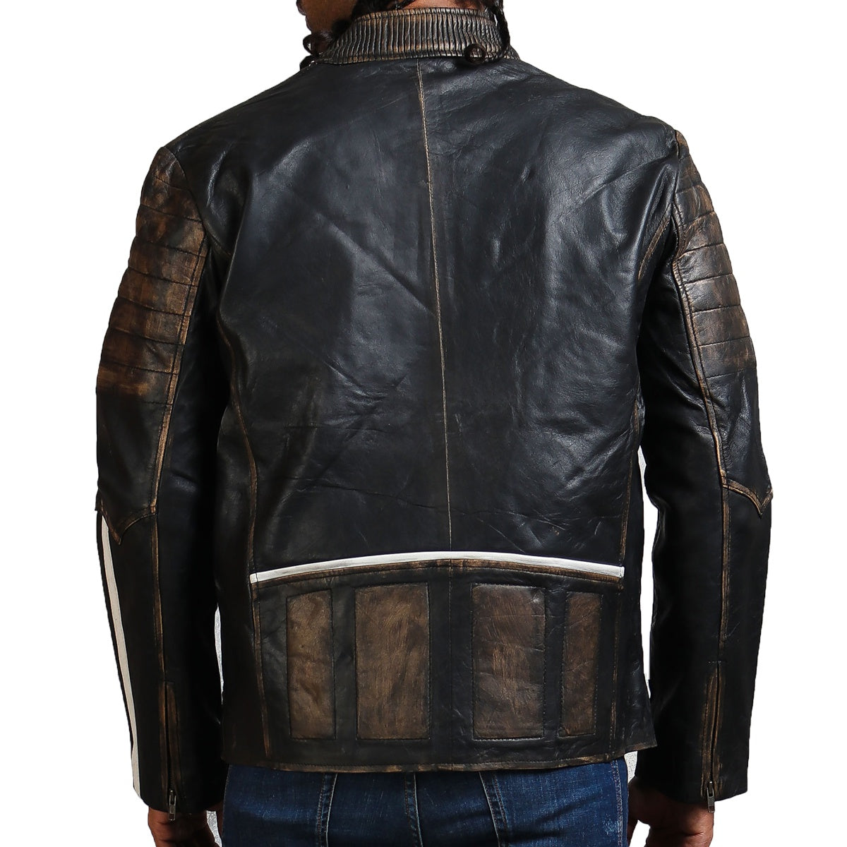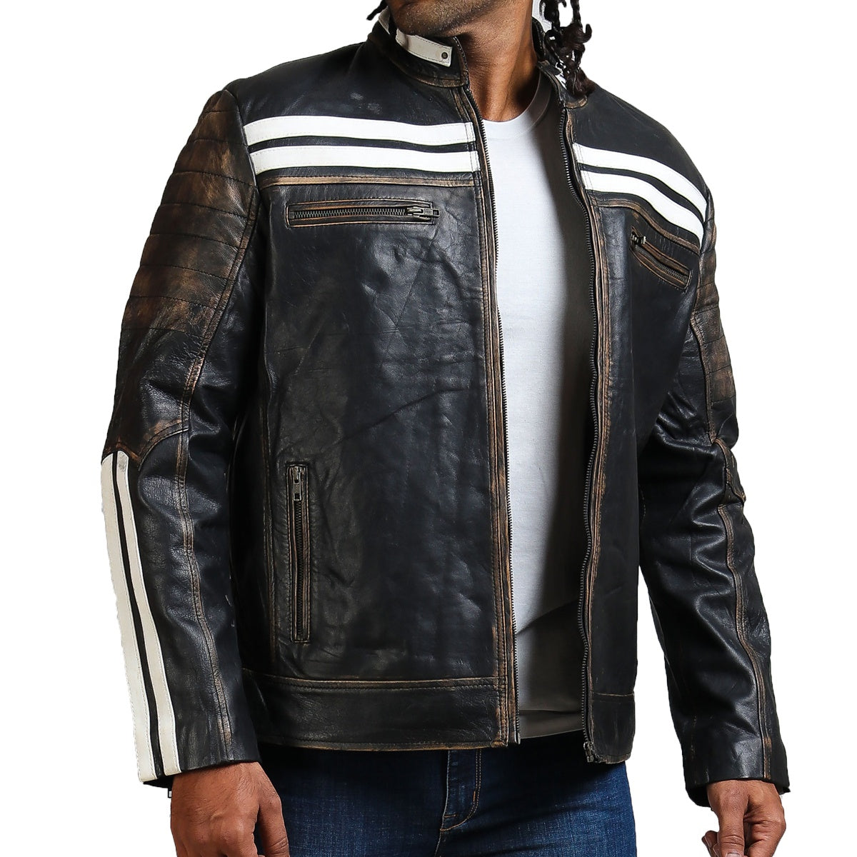 Black Genuine Leather Distressed Biker Jacket With White Stripes