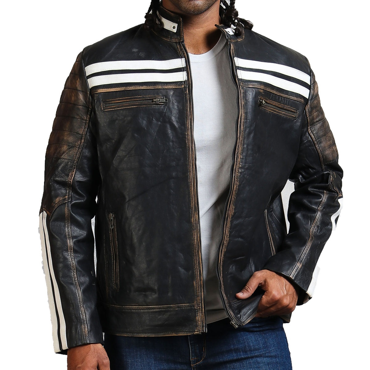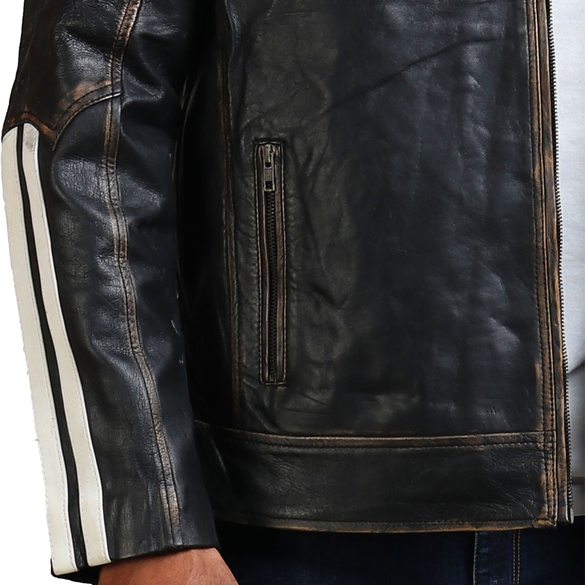 Bending resilience with longevity, it is constructed utilizing premium-quality genuine leather, making it a sustainable investment in your outerwear collection. The distressed look on this black leather jacket showcases a hint to edgy sophistication, paired with white stripes on the chest and sleeves, making it the perfect casual outerwear. This black distressed jacket makes any casual outfit feel more refined and put together, whether it is styled with jeans and a shirt or with tees and shorts. Equipped with zipper closures and zipper pockets, it ensures a snug and secure fit, paired with spacious storage for all your must-haves for a stress-free night exploring the city.