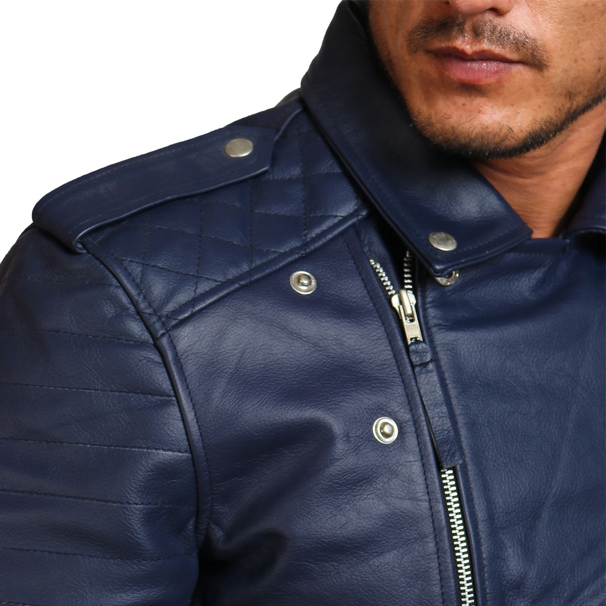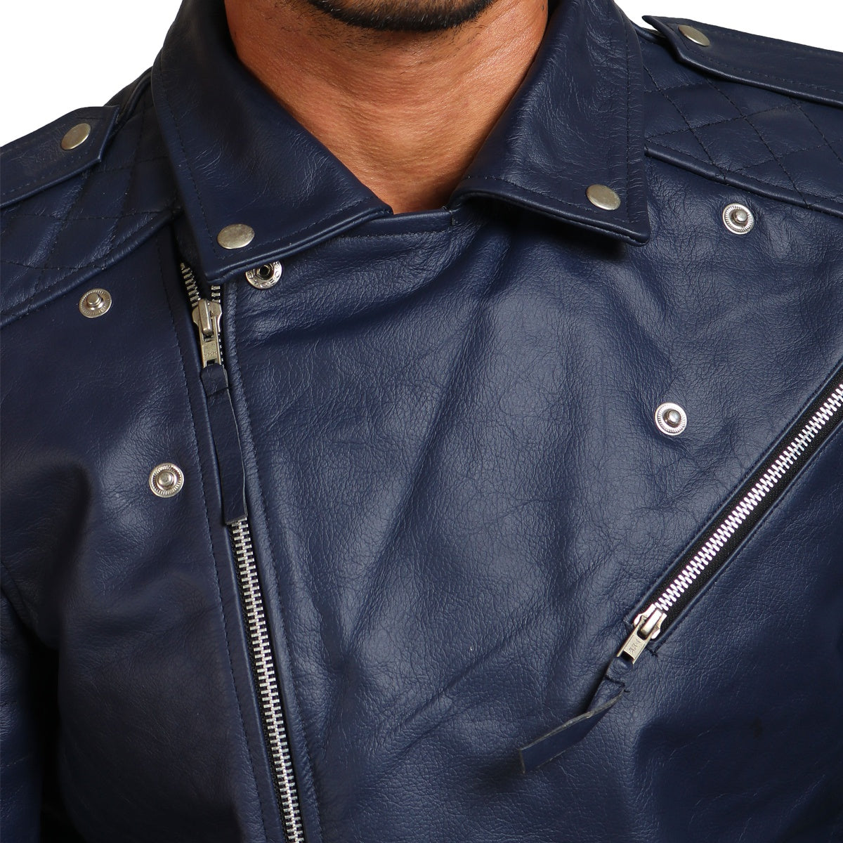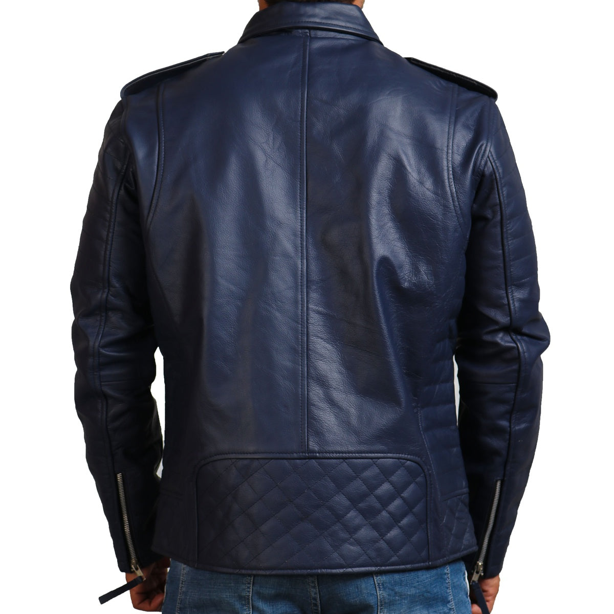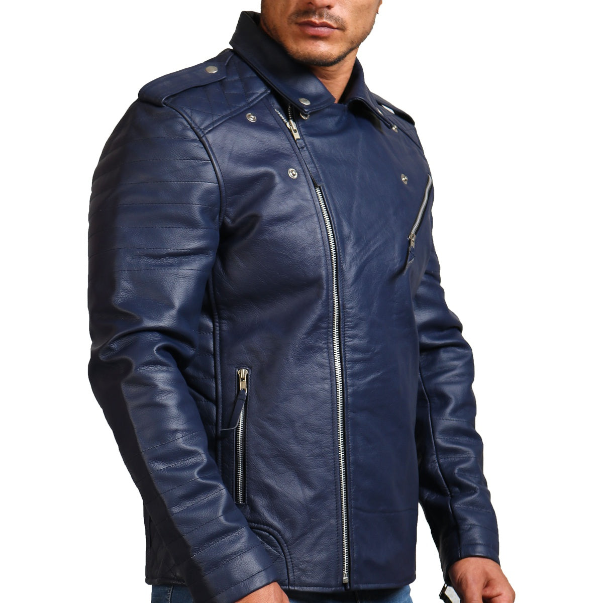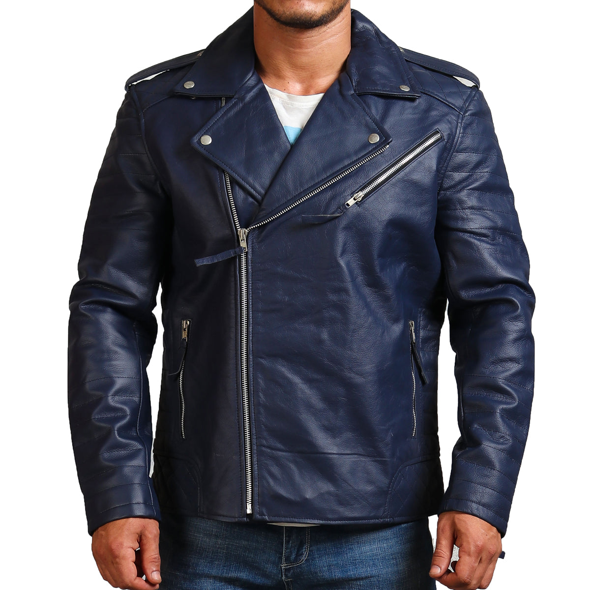 Crafted with utmost attention to detail and top-notch craftsmanship, this blue motorcycle jacket is crafted using premium-quality genuine leather, offering unmatched durability and longevity, making it suitable to be worn all year round. Offering a slim and snug fit, it embraces the wearer's structure for a fitted silhouette. Equipped with a smooth asymmetrical zipper closure for easy fastening and a secure fit, Additionally, this blue leather jacket also features spacious inner and outer pockets for storage of all your necessities.
