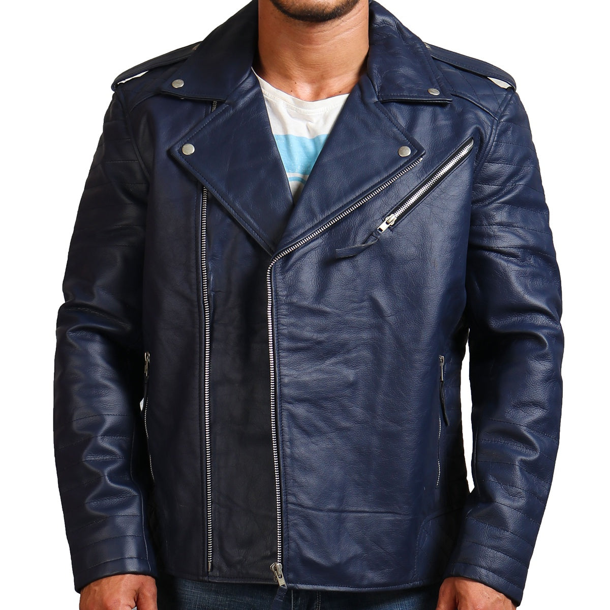 Men Classic Biker Blue Genuine Leather Jacket