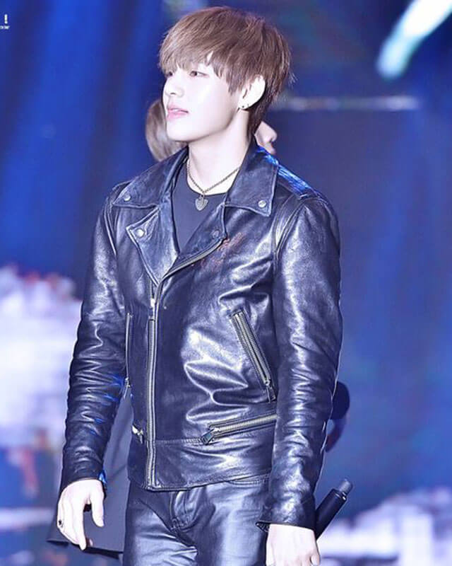 Introducing Taehyung inspired black biker jacket adorned by him during the performance. This biker jacket is the embodiment of the bad boy aesthetic, which effortlessly matches with V’s stage persona. Crafted from 100% genuine leather, this outerwear showcases a structured design, creating a fitted silhouette. The zipper closure, paired with zipper pockets, adds an urban edge to the whole look, contributing to a modern aesthetic. The interior of this outerwear is made with a viscose lining, which not only provides comfort but also adds insulation, protecting the wearer from cold and wind.