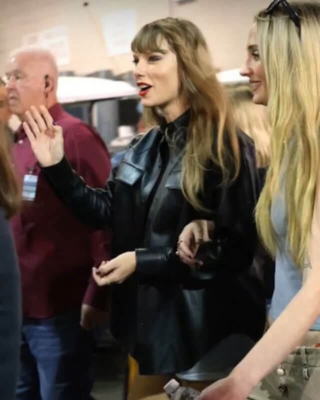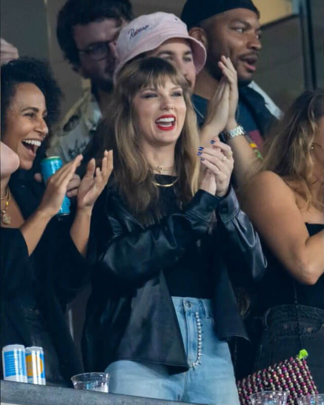 The most renowned artist of our generation, Taylor Swift, is always in the spotlight, not only because of her music and ground-breaking records but also because of her impeccable sense of style and fashion. Showing support for her boyfriend Travis Kelce, Taylor was seen in a black leather jacket while attending the game. She showcased her enthusiasm in the stadium by cheering her love amidst the crowd and fans.