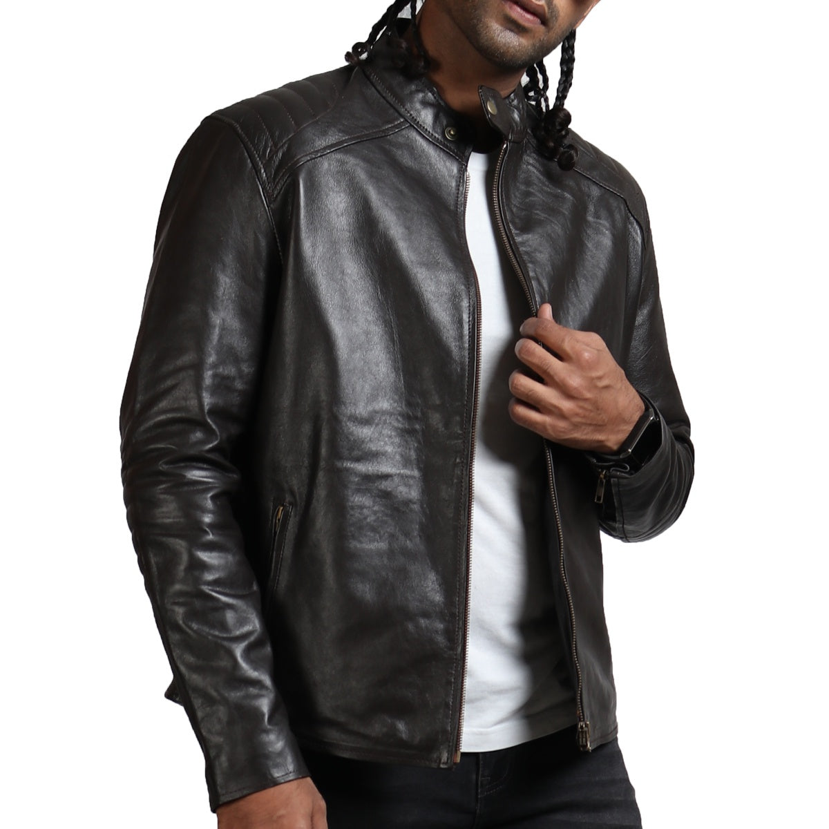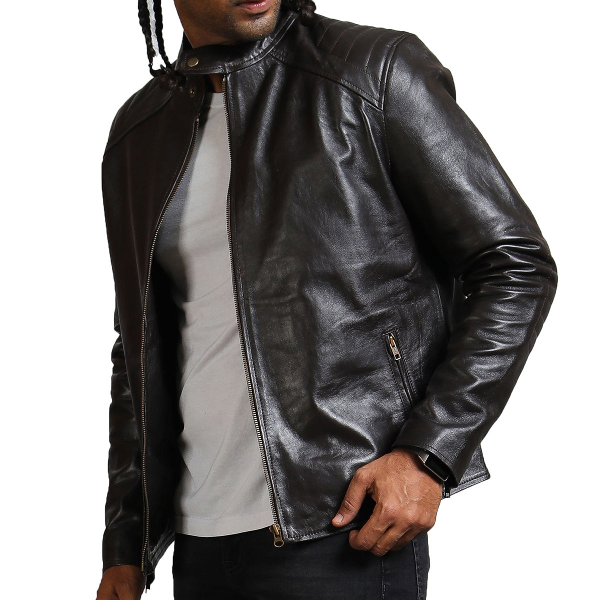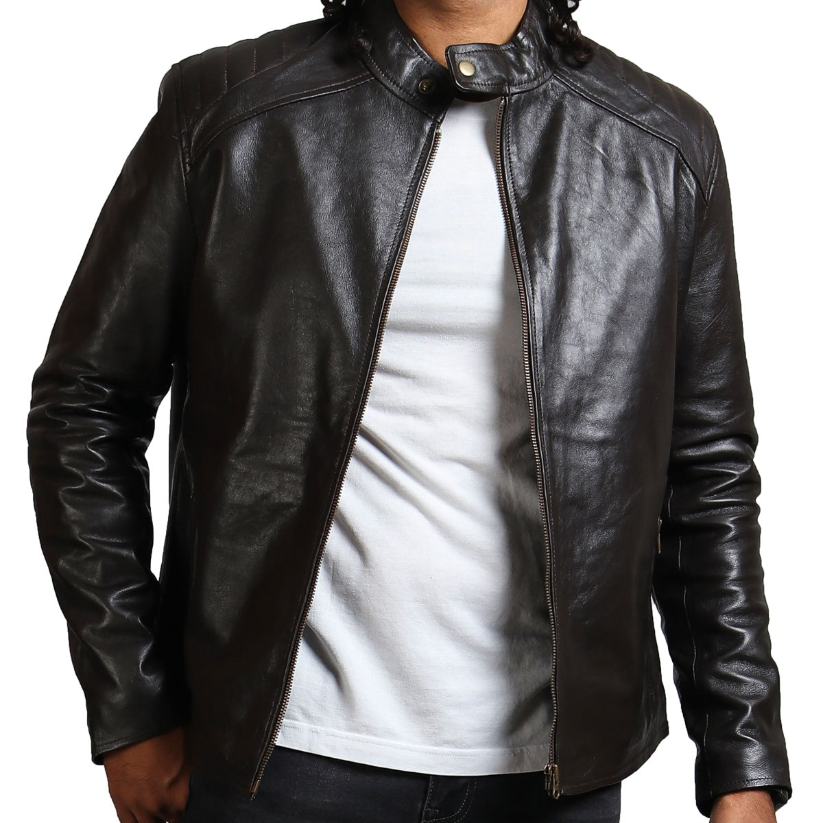 Embrace luxury as this dark brown jacket is tailored to perfection using genuine leather, wrapping the wearer in cozy comfort while the soft, supple material drapes seamlessly around your structure, enhancing the silhouette. A full zipper closure ensures a snug and secure fit while adding a modern touch to the overall classic design. Additionally, this brown leather jacket is equipped with inner pockets and outer zipper pockets for carrying all your essentials, whether wallet, phone, keys, or other necessities, on the go.