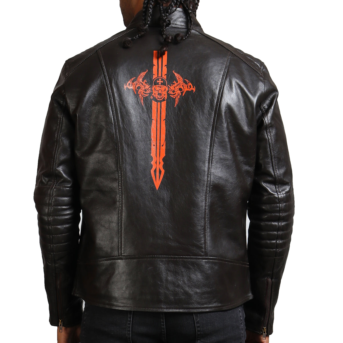 Red Skull Sword Dark Brown Motorcycle Leather Jacket