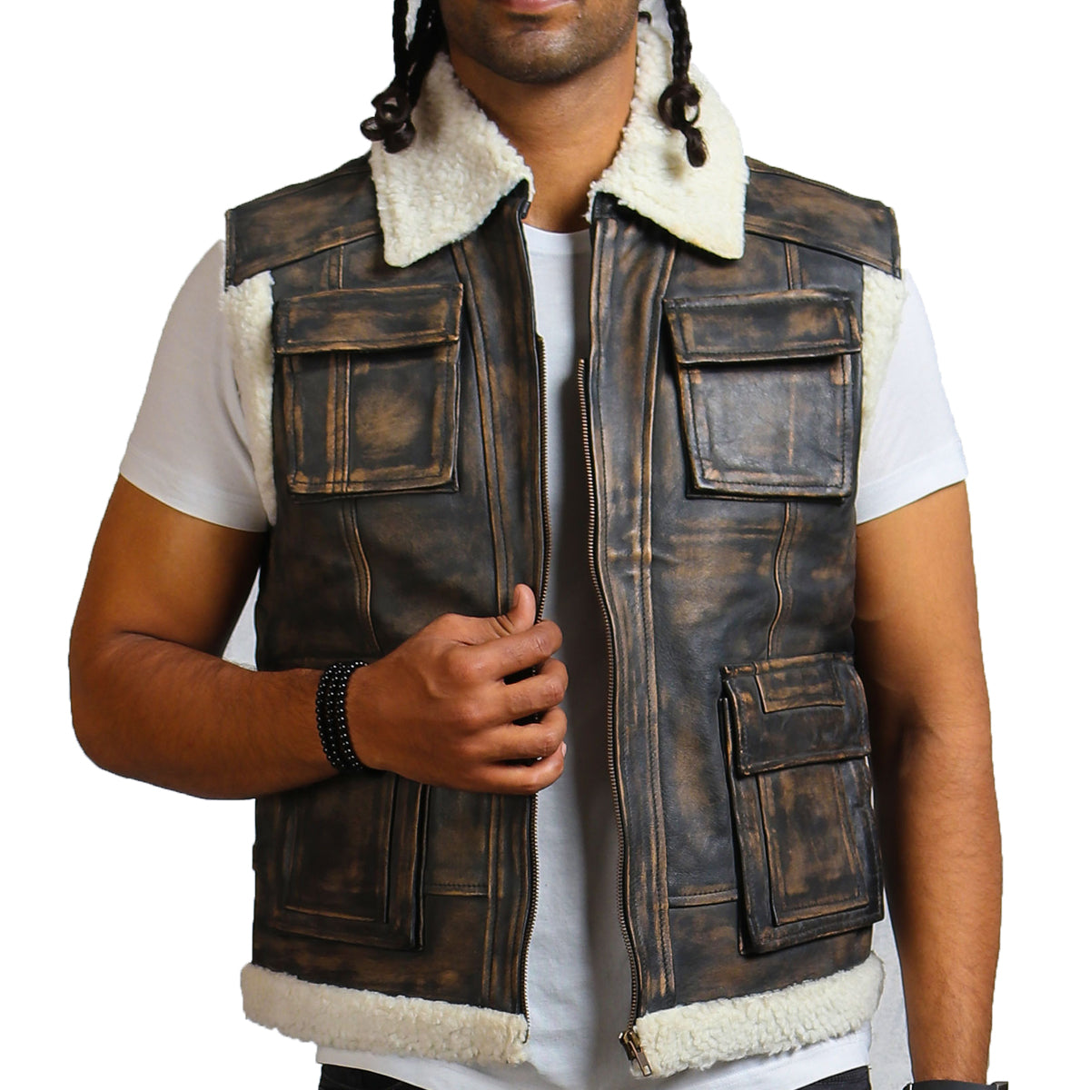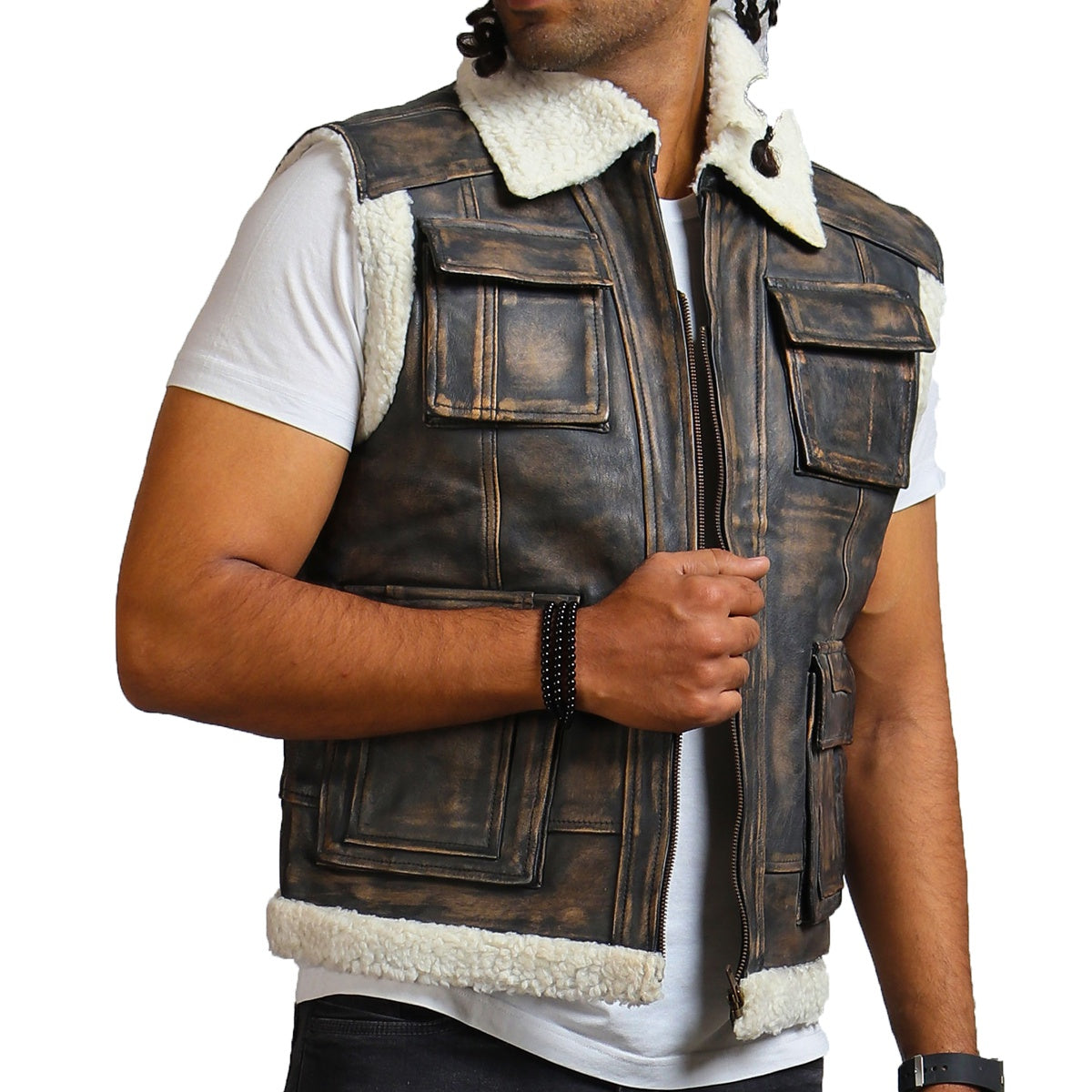 The white and dark brown is a classic combination, contributing to the versatility of pairing with an endless variety of different outfits. This dark brown leather shearling vest effortlessly elevates the look of any attire it is paired with, making it a statement piece in your wardrobe while allowing ease of styling, saving you time and energy. Four strategically placed outer pockets not only offer spacious storage for all your essentials but also add a sleek and polished look to the overall design.