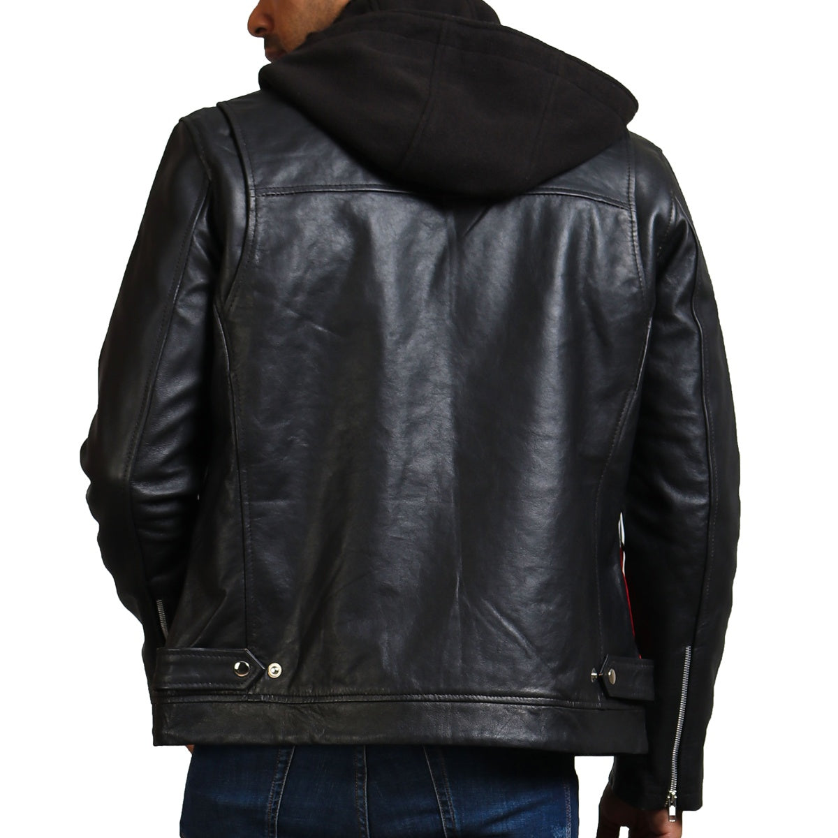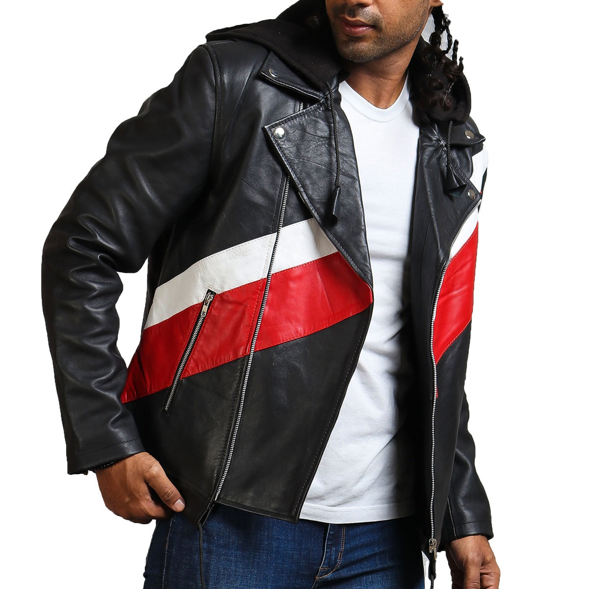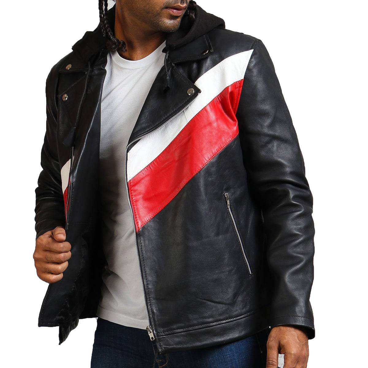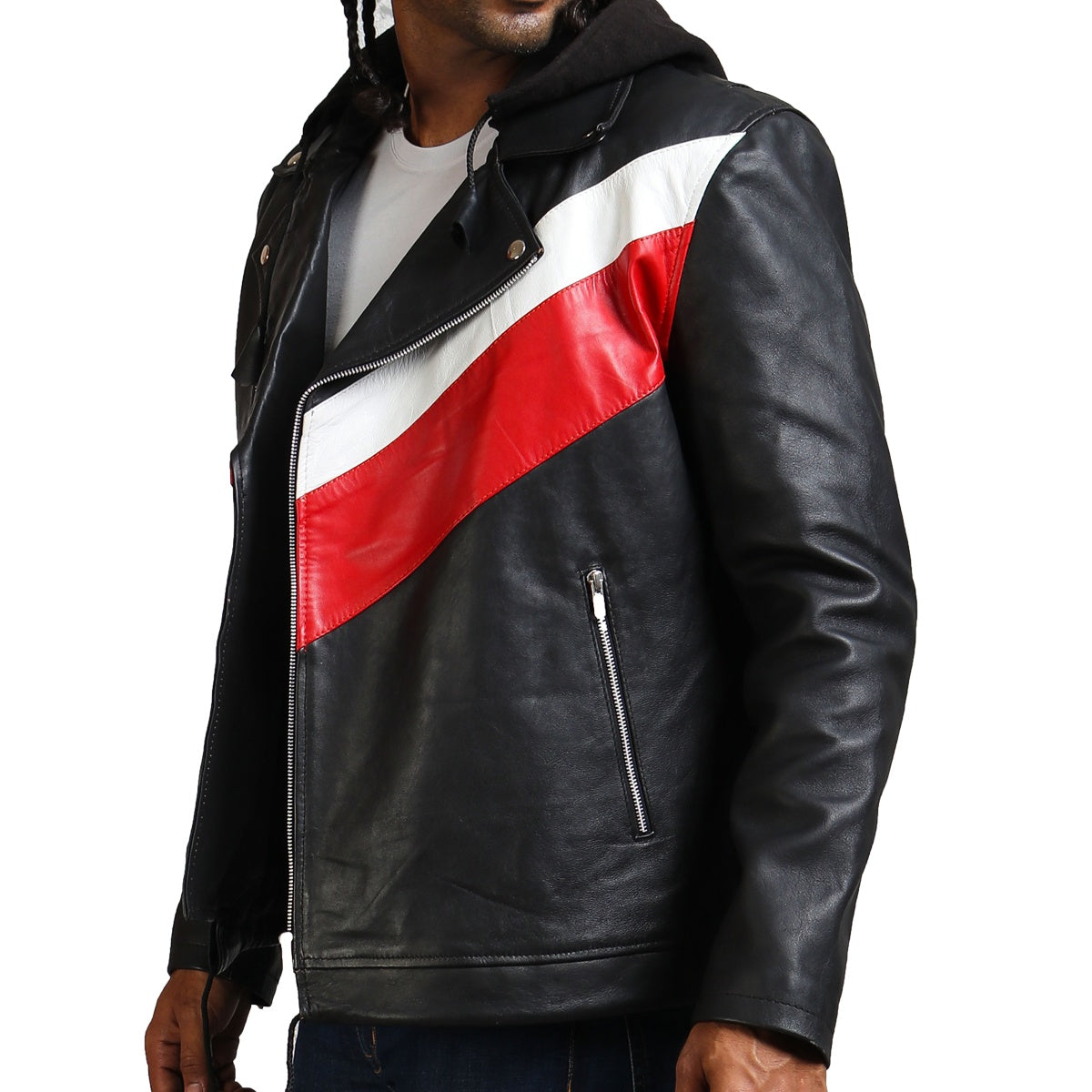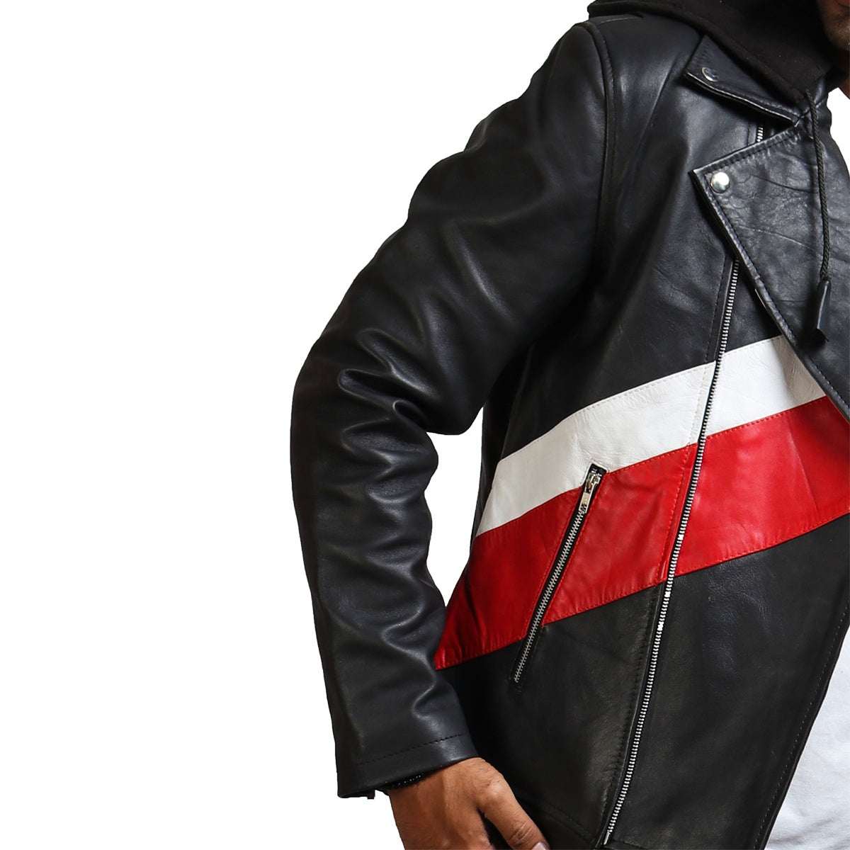 Men's hooded leather jacket with red stripe is a casual leather outerwear emanating young and joyful vibe. A must have, made with real leather jacket with hood.