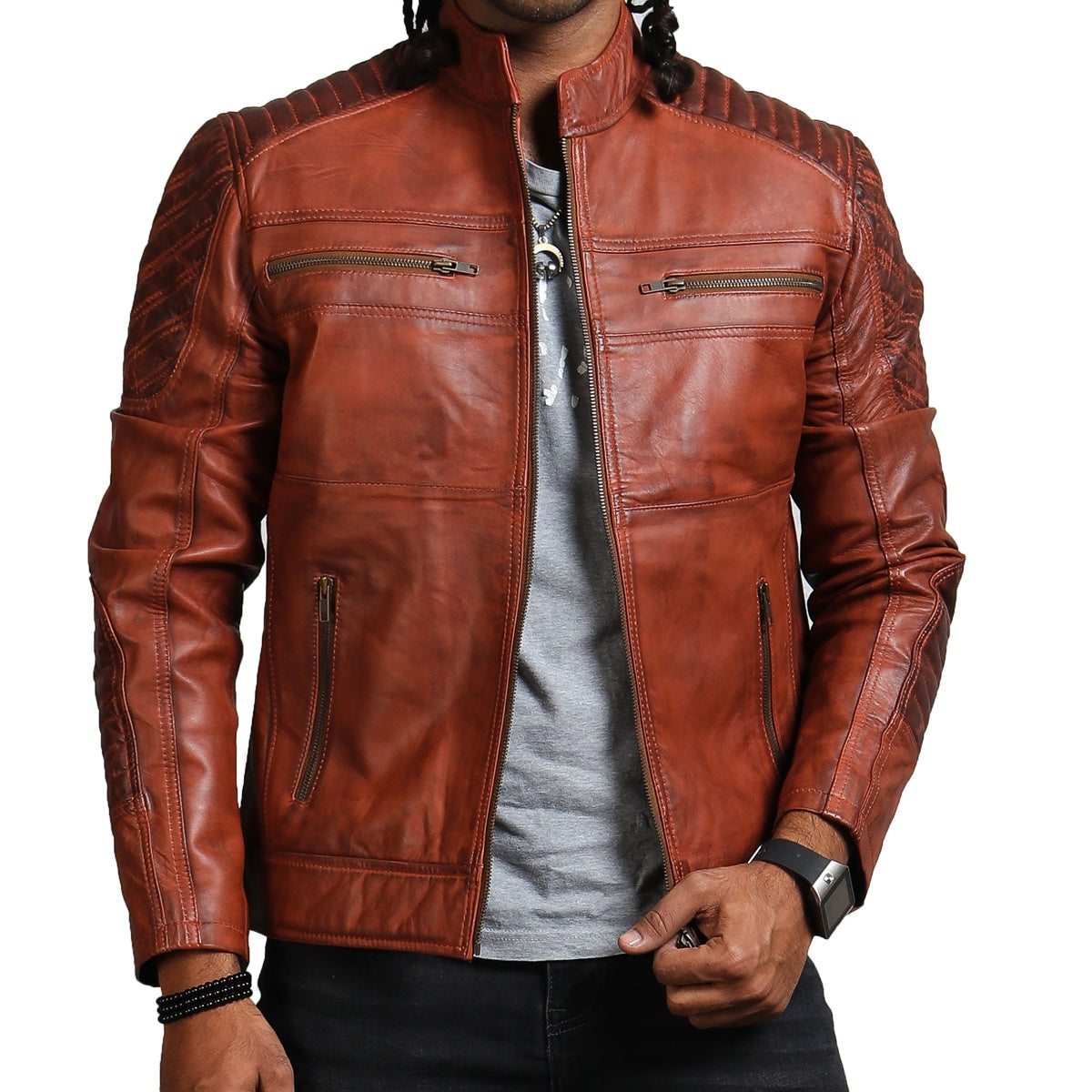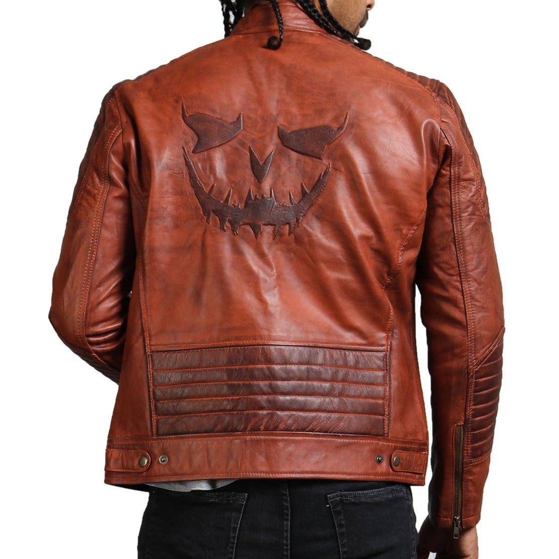 Brown biker scarecrow leather jacket, is hand-waxed by professional craftsmen on genuine leather. This vintage scarecrow biker jacker is padded and has quilted design on shoulders and back to look stylish while providing extra support.