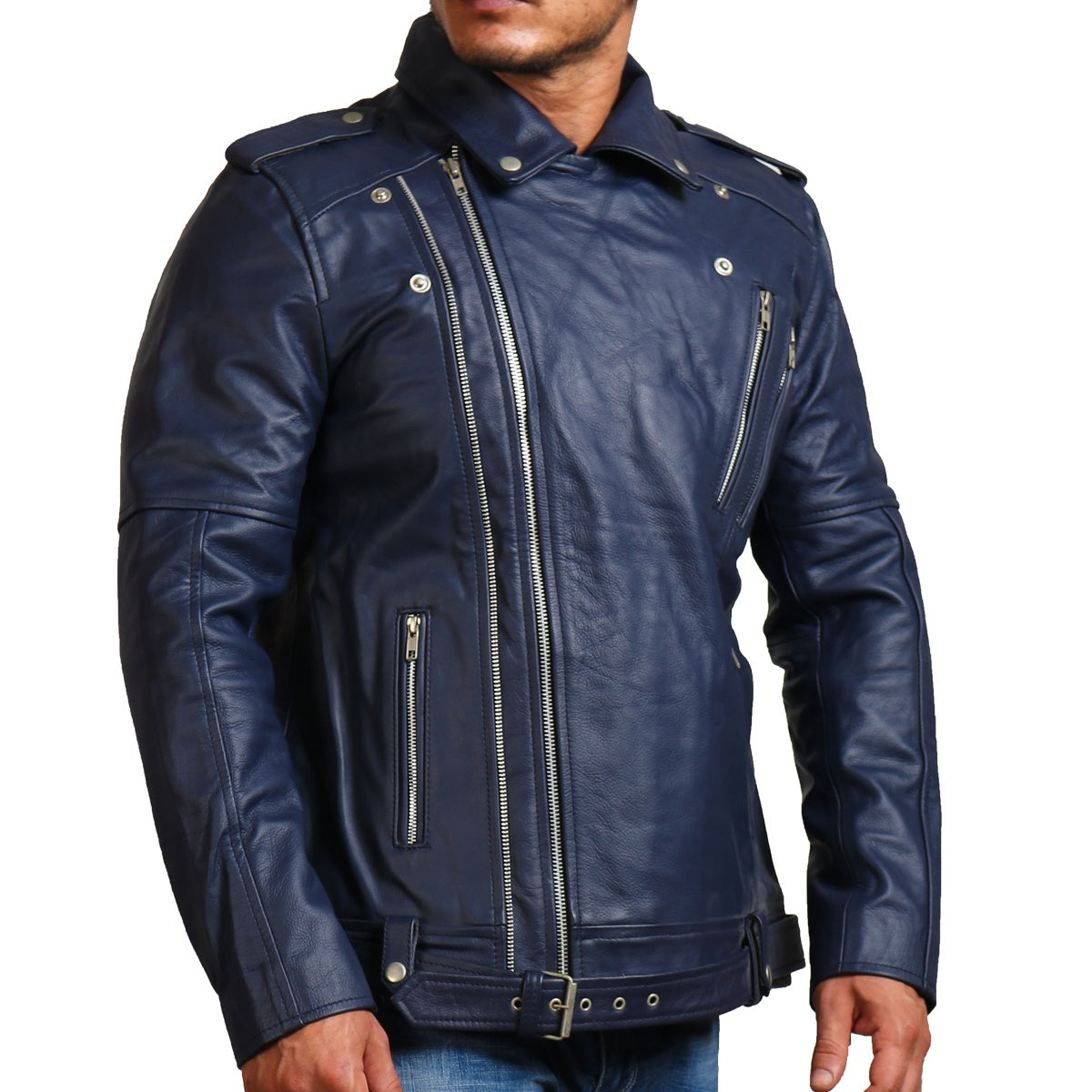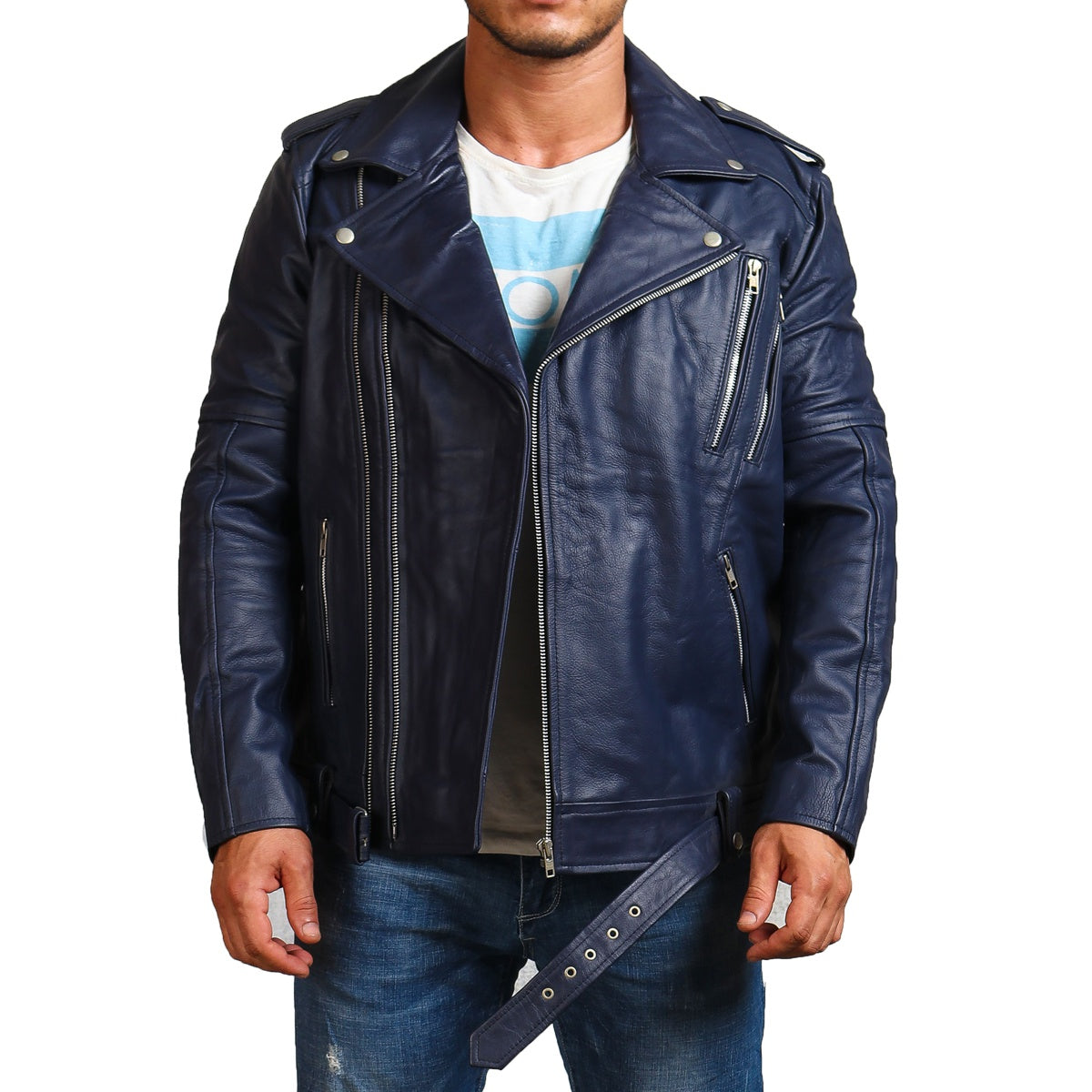 Men's Blue Motorcycle Leather Jacket for Motorcycle Enthusiast