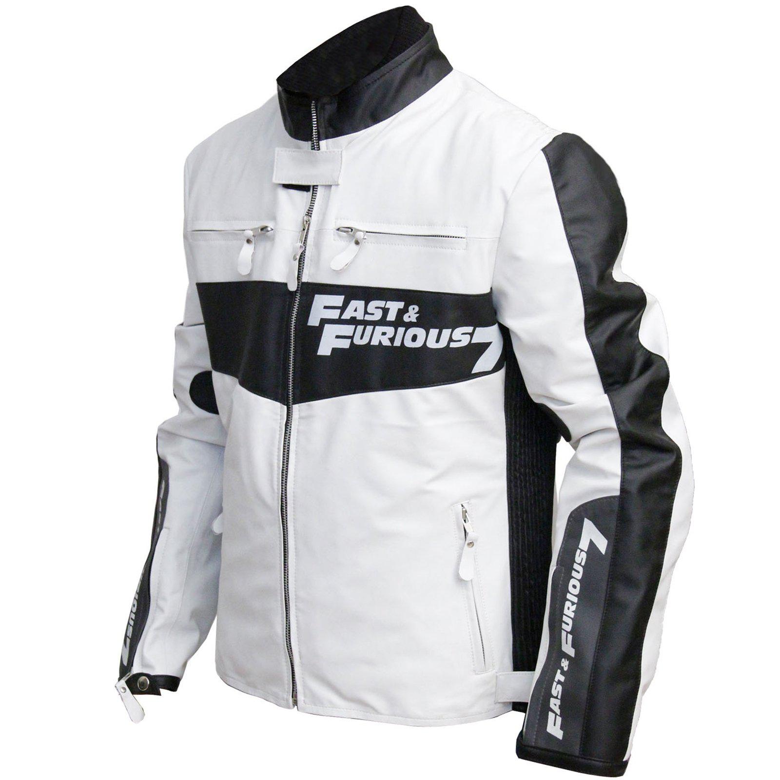 Men's Vin Diesel as Dominic Toretto Fast and Furious 7 motorcycle leather jacket. 100% real cowhide black and white leather. Best leather gift outfit for Fast and Furious fandom. Shop cafe racer leather jackets for bikers and mountain riders. Also refer to picture shared by a happy customer. Find more brando, retro and motorcycle leather outfits at Alex Gear. Shop this Vin Diesel inspired racer jacket for men today!
