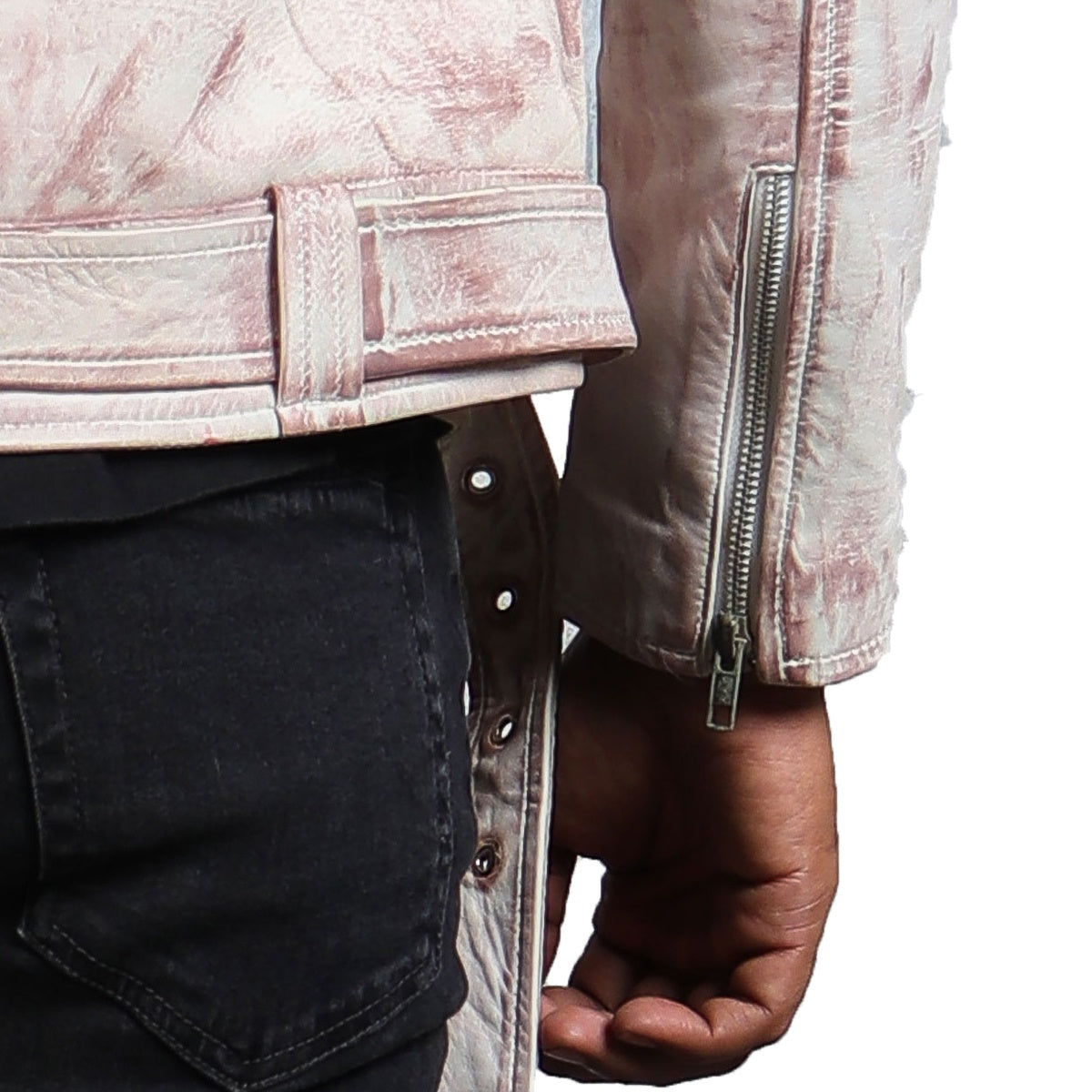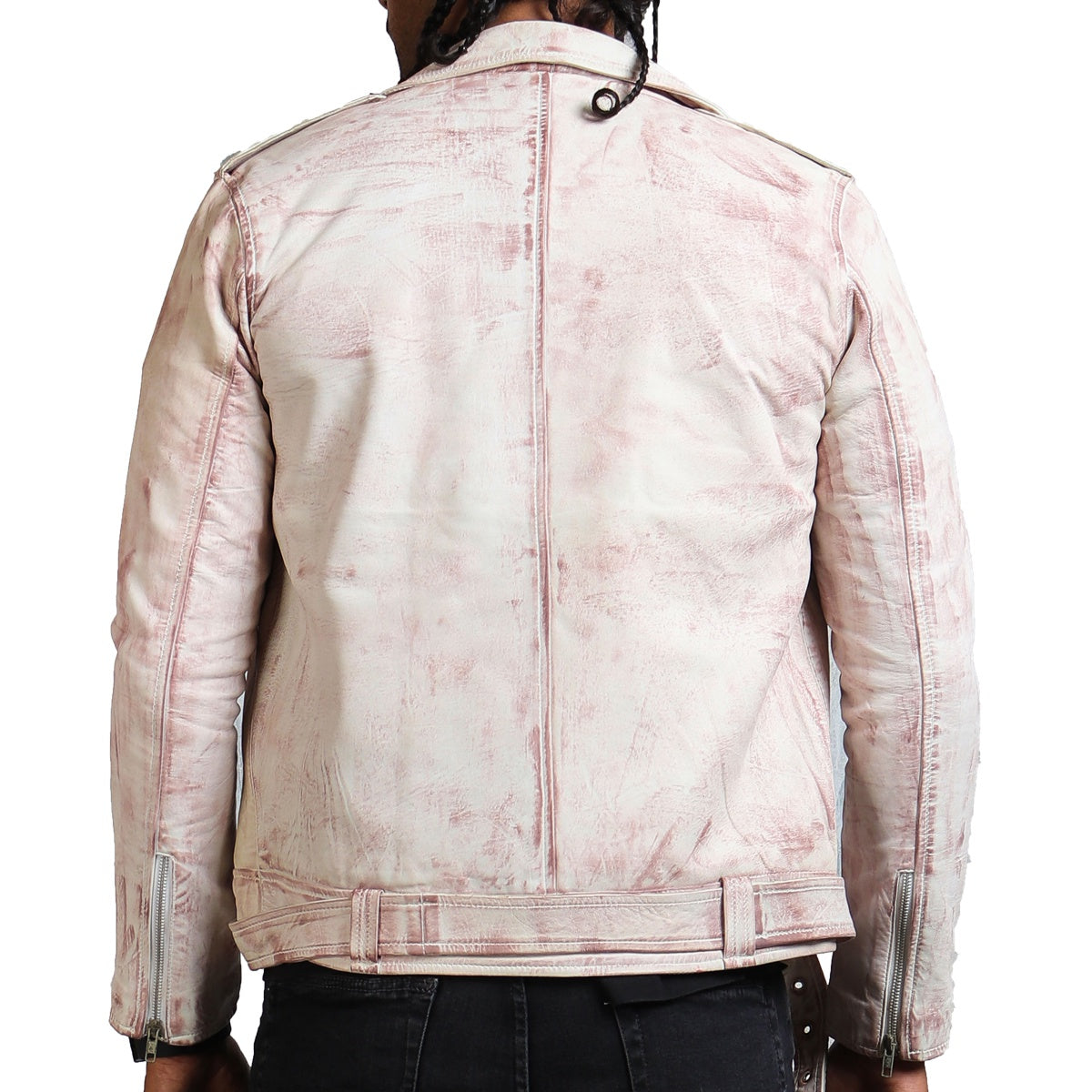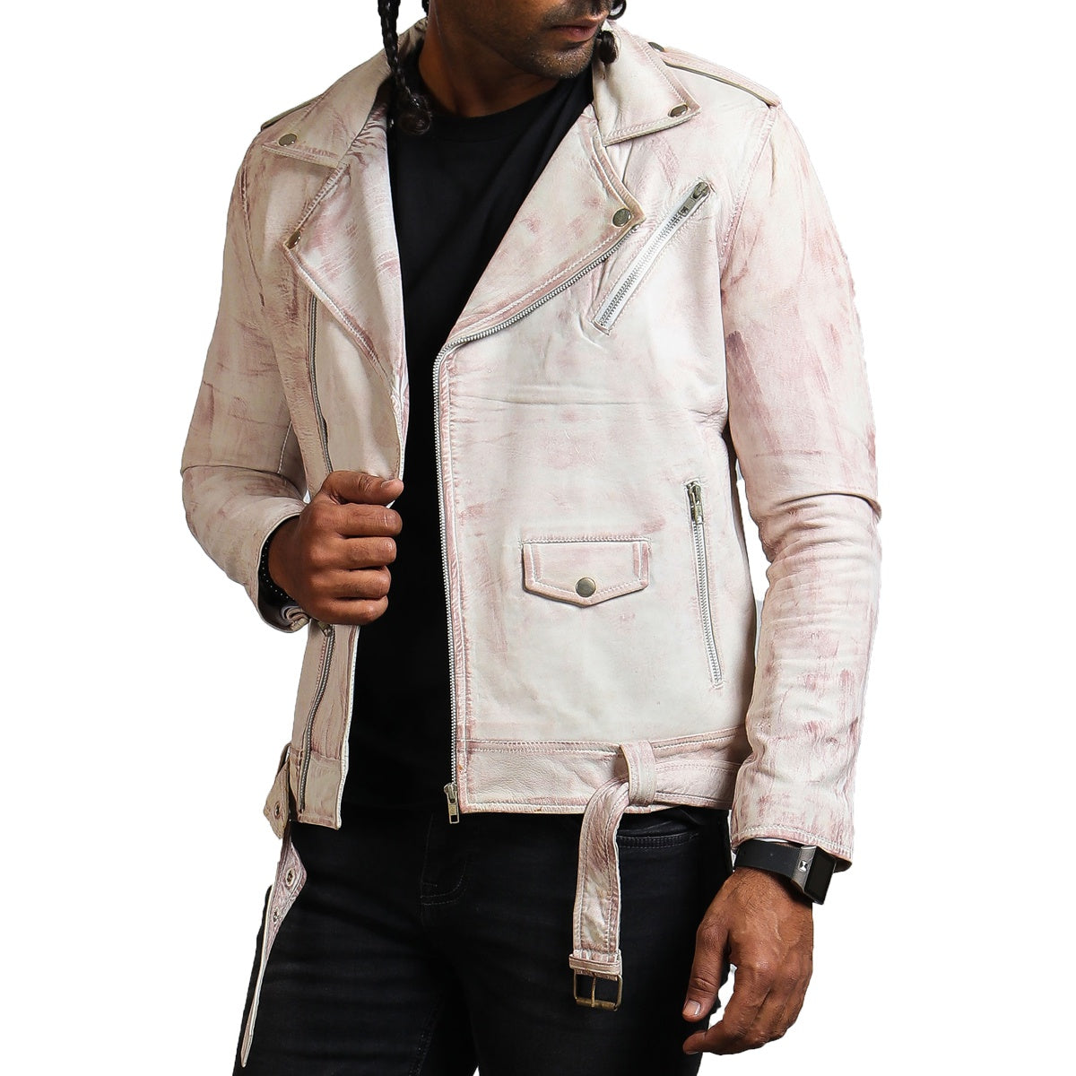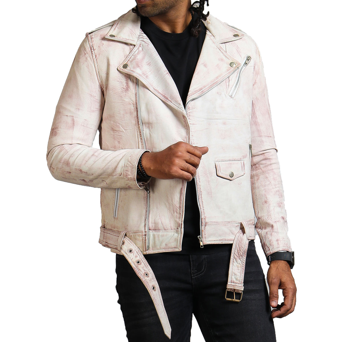 Designed to make an impression, this white biker jacket showcases meticulous tailoring by our skilled craftsmen, boasting top-notch quality. Crafted using genuine leather, it provides durability paired with unmatched comfort, making it a perfect addition to your wardrobe. The interior utilizes a soft viscose for breathability, paired with a hand-waxed exterior for protection against scratches, making this white biker leather jacket one of the best outerwear you will ever adorn. The classic features like an asymmetrical zipper closure, zipper pockets, a coin pocket, and a and a belted waist make this jacket a high-end and highly functional design.